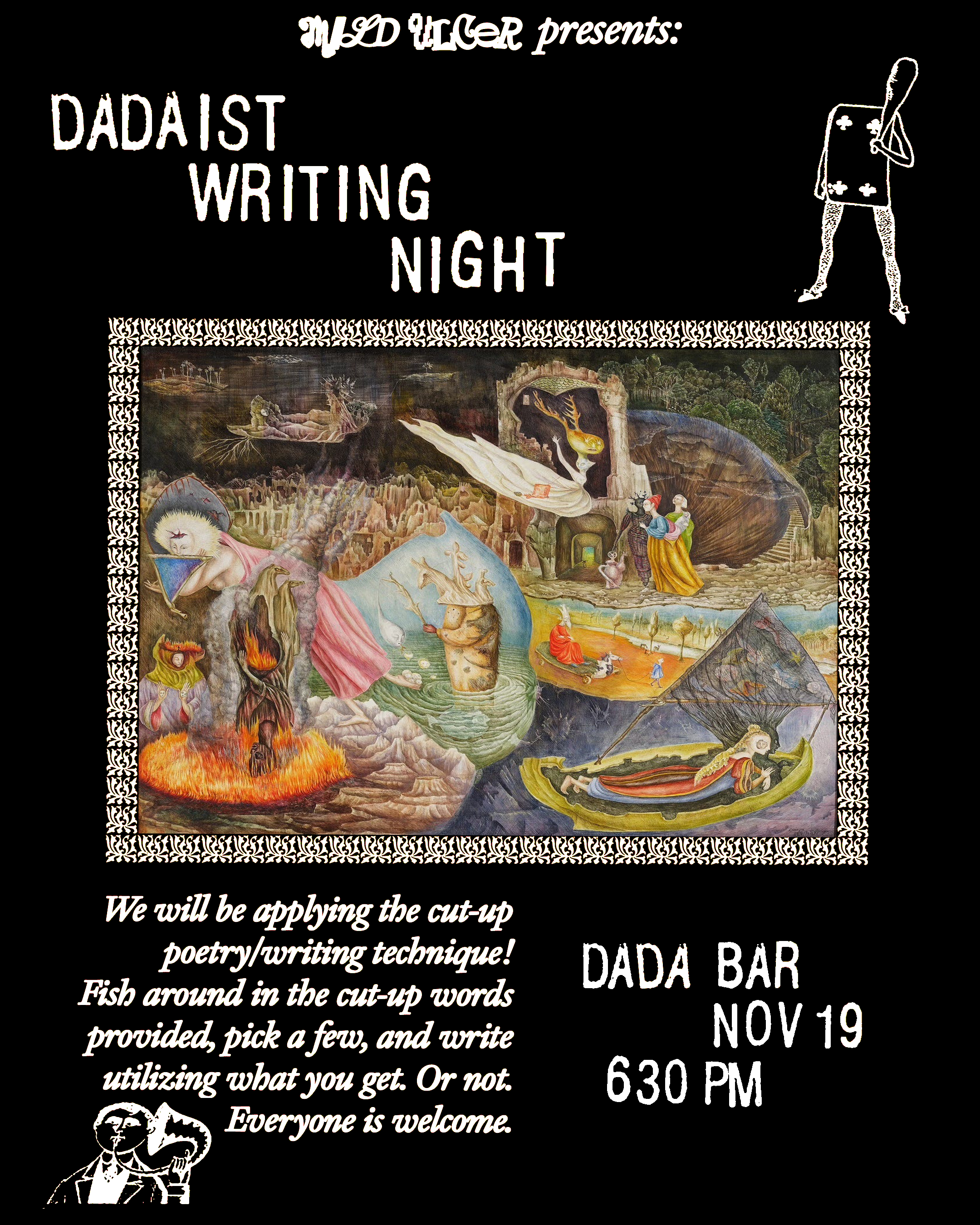 At this event we will be utilizing the cut-up technique, a Dadaist creative writing method first described by Tristan Tzara in 1920.